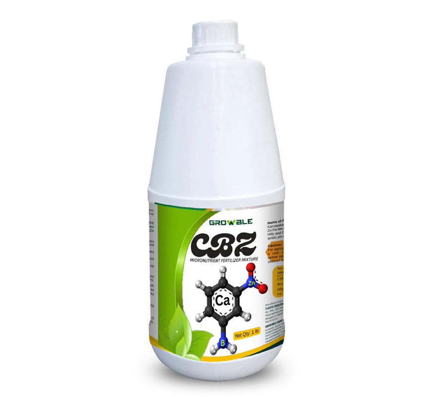 Read MorePowerful Zn - B & Ca Micronutrient Fertiliser Blend for Healthy & Productive PlantsCBZ is a unique mixture of Micronutrient liquid fertilizer for foliar application specially designed to manage Ca - Zn and B requirements in plants. Advantages of CBZ It is useful in synthesis of vital hormones associated with proliferation and elongation. Corrects Ca - Zn & B Deficiencies Effectively Enhances Flowering, Fruit Set & Root Development Improves Nutrient Absorption & Crop Yield Supports Healthy Growth at All Stages It protects the plant body against most diseases, biotic and abiotic stress factors.